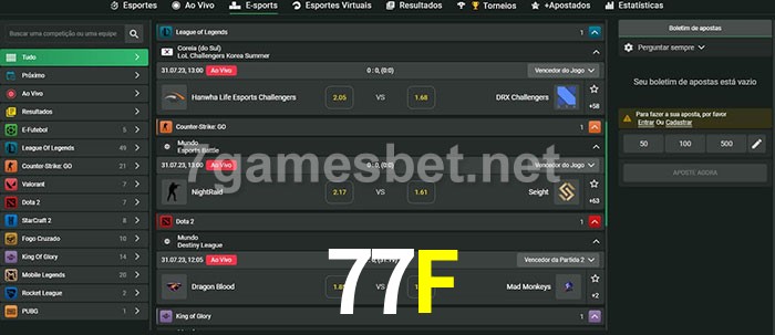 O 77F oferece uma grande seleção de opções de apostas em e-sports com probabilidades competitivas